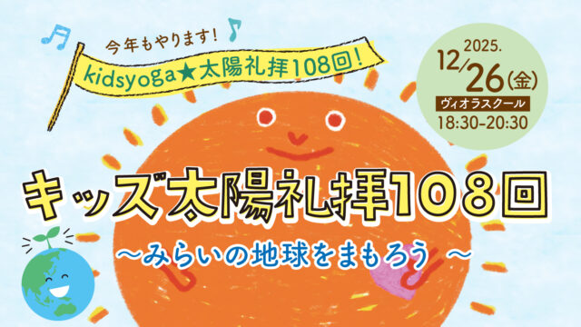 スタジオからのお知らせ 2025年12月26日(金)『キッズ太陽礼拝108回 ~みらいの地球をまもろう~』【大阪・本町】 ヨガヴィオラトリコロール https://www.yoga-viola.com/wpblog/wp-content/uploads/2023/11/logo.png viola tricolor ws