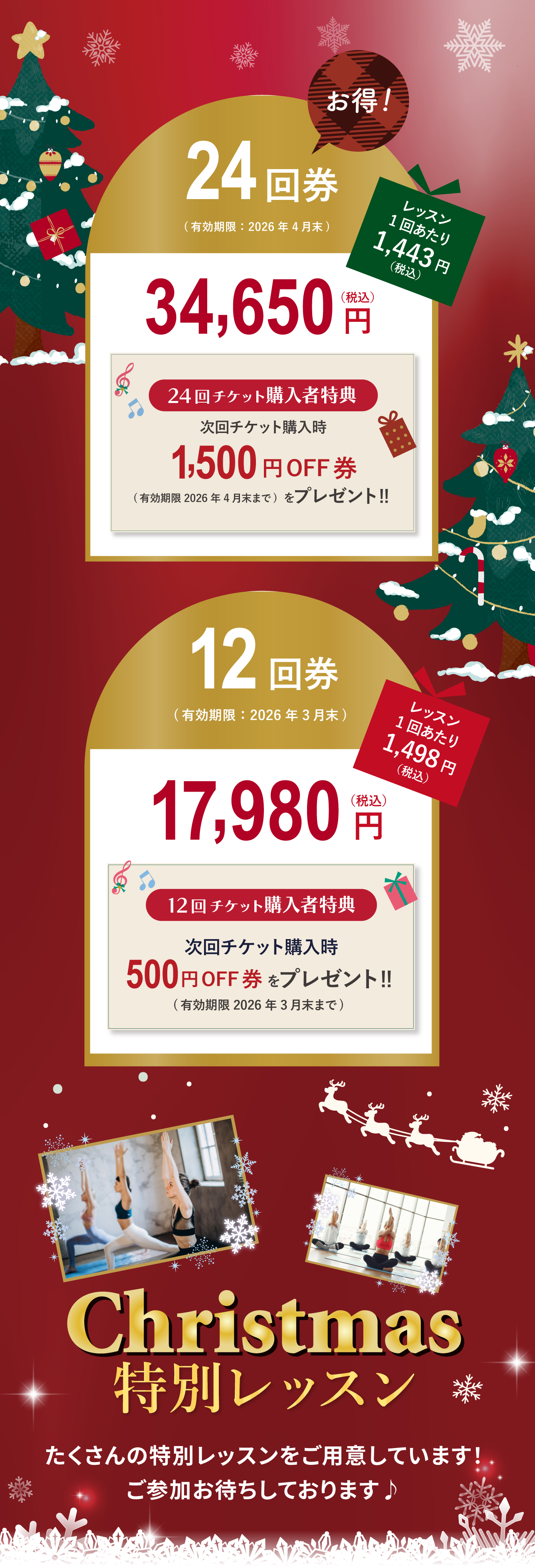 スタジオからのお知らせ 年に1度のクリスマスチケット限定販売![販売期間:2025/12/1(月)~12/29(月)] ヨガヴィオラトリコロール 2025年11月11日 ▶︎▶︎特別レッスン詳細 ※クリスマス特別レッスンは変更となる可能性がございます。 ヴィオラトリコロールサポートセンター TEL:06-6926-8422 受付時間:月-金 10:00~18:00 休み:土日祝 お問い合わせ □ヨガ・ピラティス スタジオ □ヨガ・ピラティス インストラクター養成スクール □リフォーマースタジオ