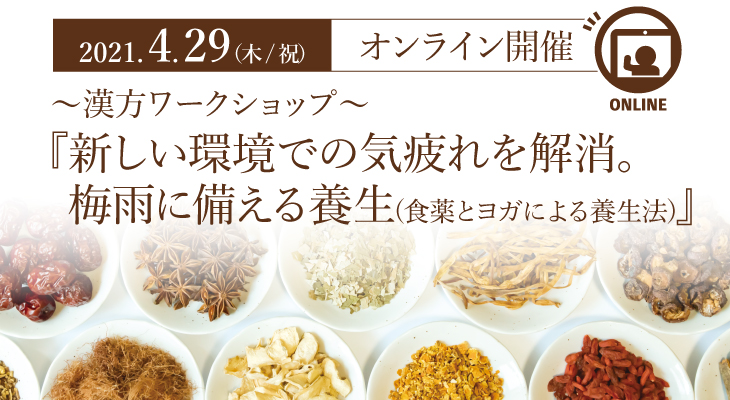 ■日 時 | 2021年4月29日(木・祝) 11:00~12:30(90分) 『新しい環境での気疲れを解消。梅雨に備える養生(食薬とヨガによる養生法)』 |