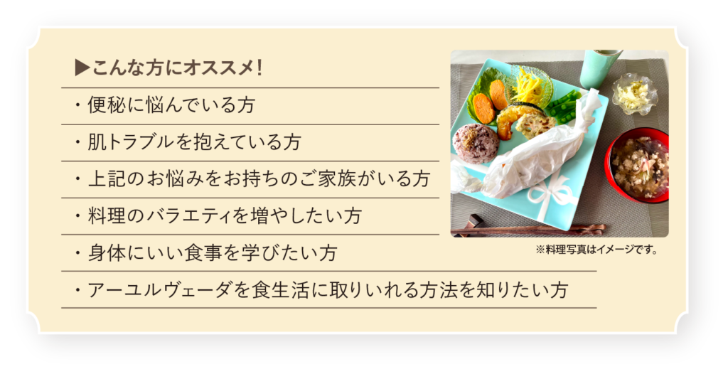 現在は女性や子供、高齢者の健康増進のためアーユルヴェーダクッキングや料理教室を自宅にて開催。