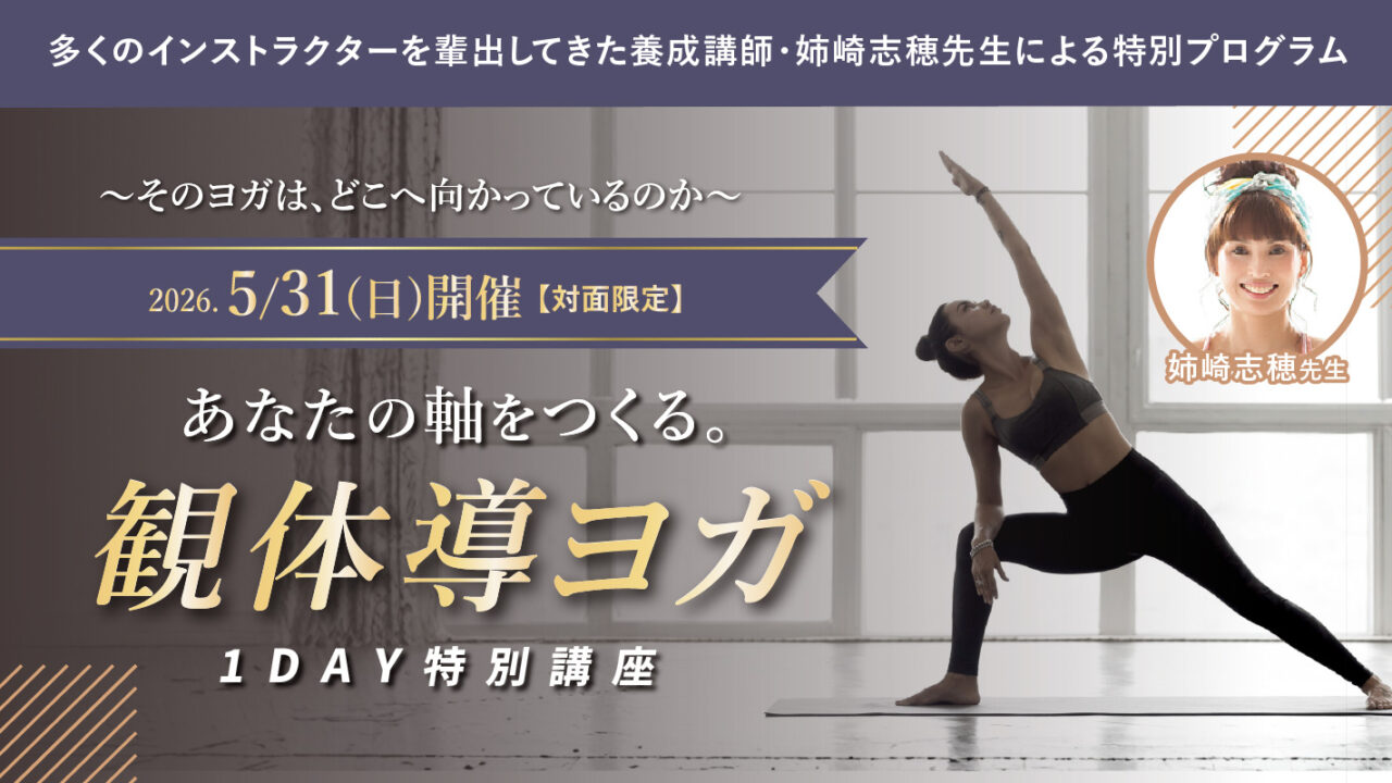 | ■日 時 | 2026年5月31日(日) ①-1 「観」:10:00-11:30(1.5時間) ①-2 「体」:12:00-14:00(2時間) ② 「導」:15:00-17:30(2.5時間) ①-1・①-2 はヨガを日々実践されている一般の方にも是非ご参加していただきたいです。 |